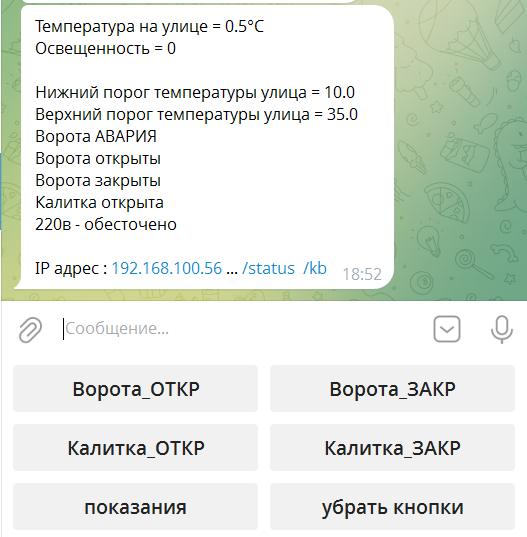 При наличии датчика состояния калитки (геркон), его состояние отображается в этом разделе, с возможностью отправки сообщений в телеграм.