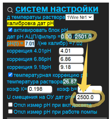 Ждем некоторое время (около 30сек) и вписываем полученные показания из поля дат pH АЦП в поле: U смещения на ОУ дат pH=